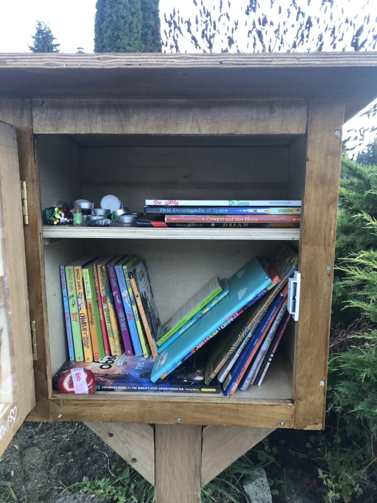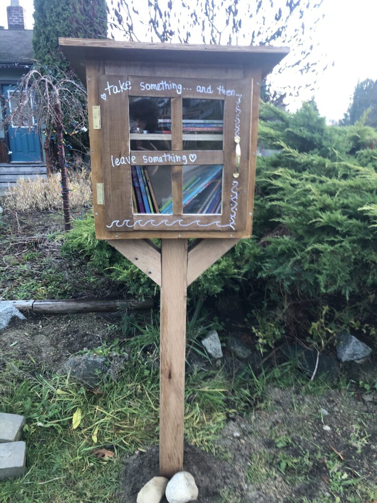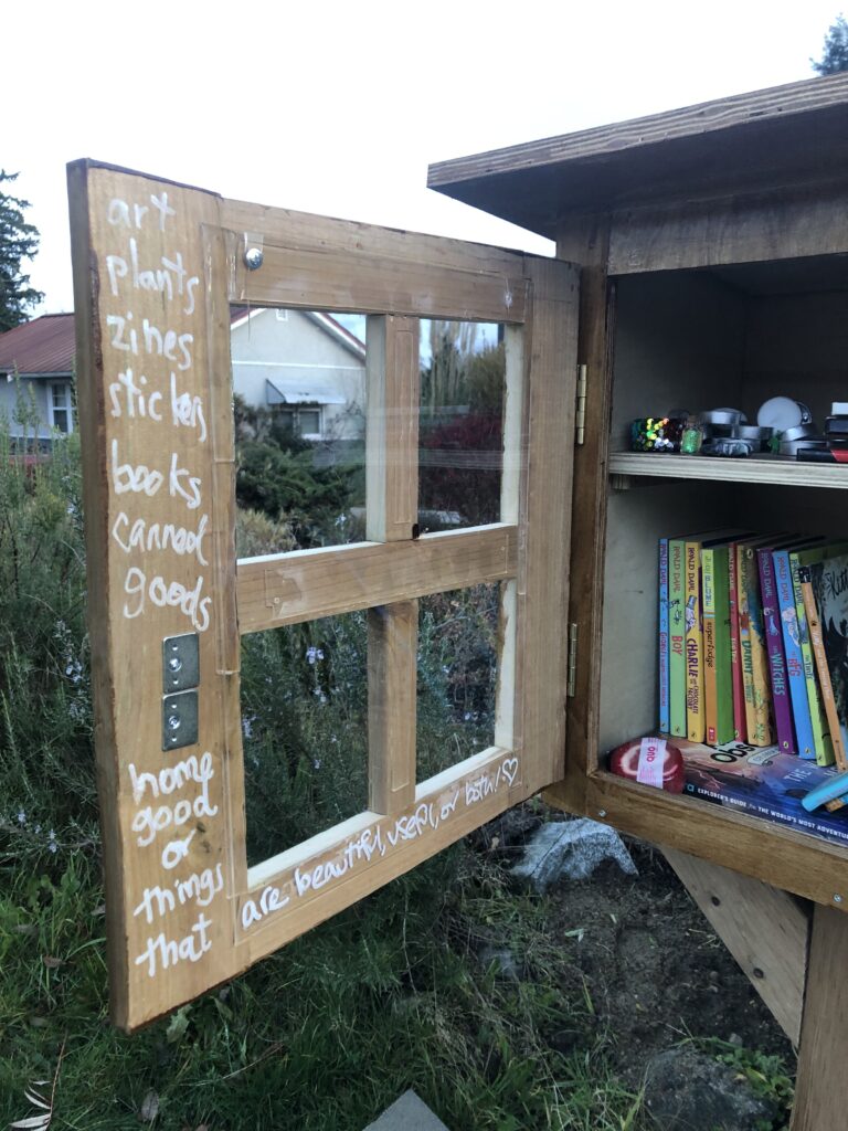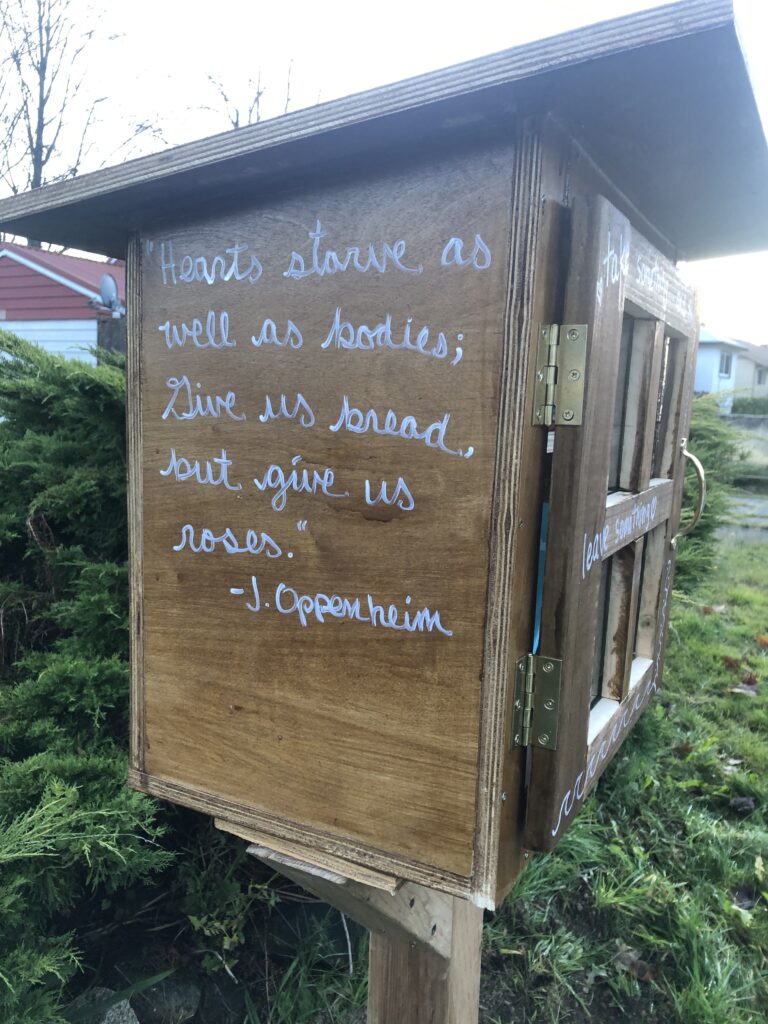 It has been a delight to see families or walkers stop, pause to take some thing or give some thing and walk away smiling. So far there have been donations of glitter jars, dog treats, granola bars, soap, personal hygiene items, canned goods, children’s books, adult novels, and a few favourite rocks and crystals.