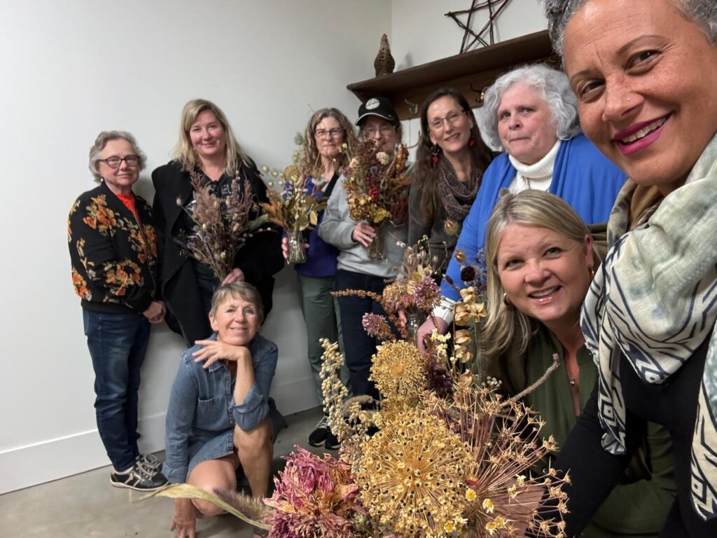 The next month, the activity was dried floral arranging with an artist in Aldergrove, who grew dozens of different flowers and plants on her property. From this abundance and variety of flowers we were lead through the aspects of creative dried floral arrangements using height, color and texture. This was a thoughtful class through which our selection of flowers brought out what was individual in us all. Every arrangement seemed to reveal more about the designer, their style and choice of flowers.