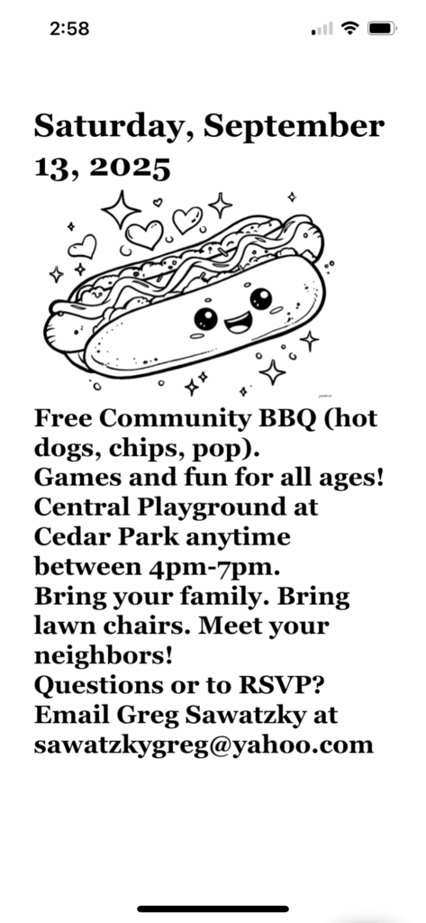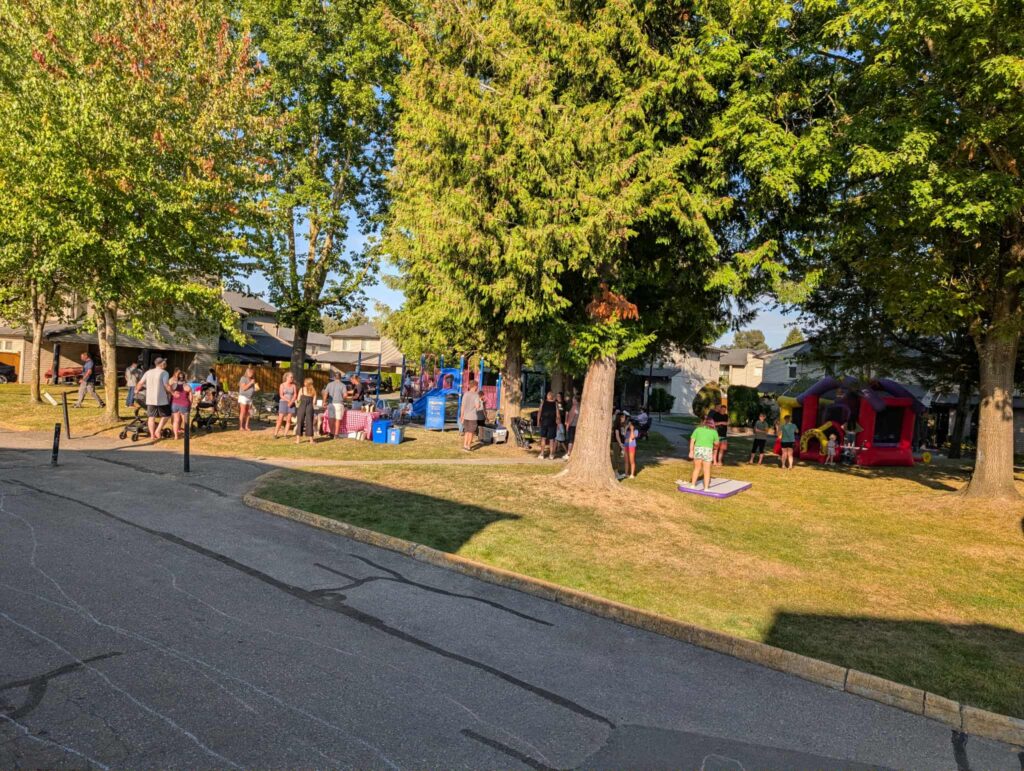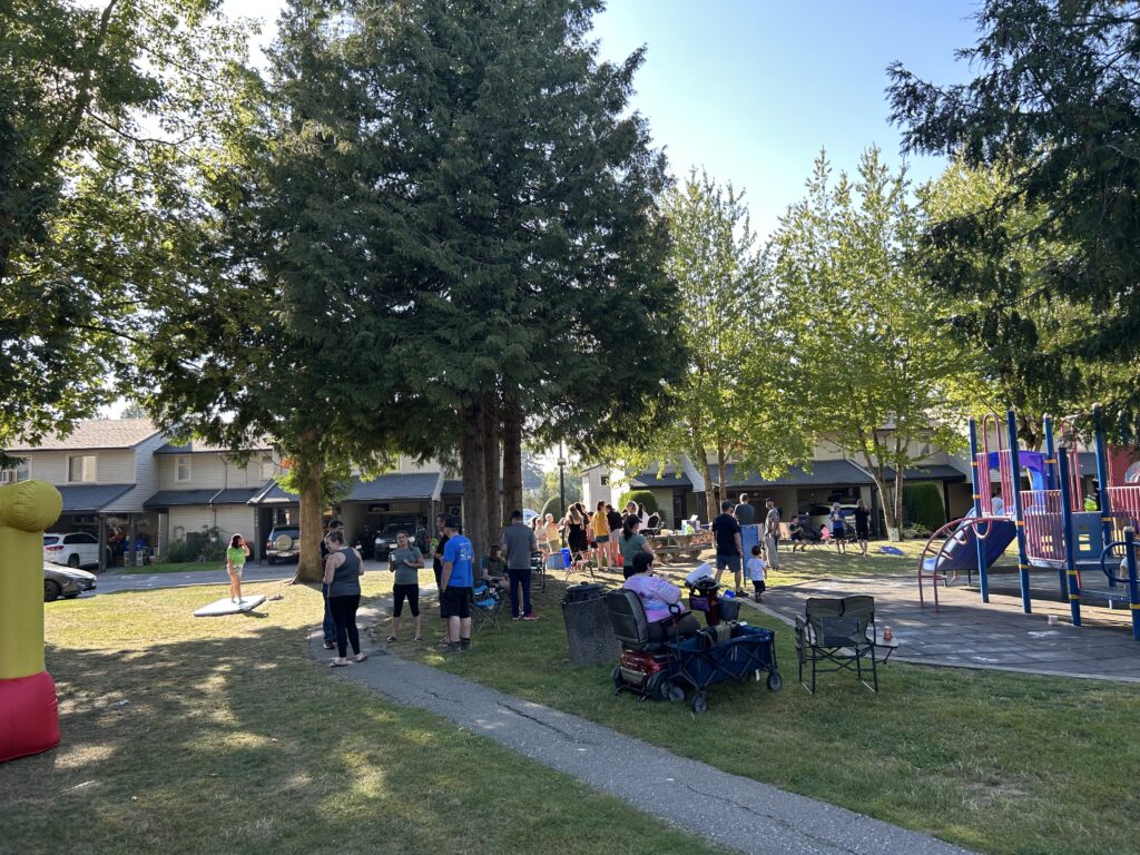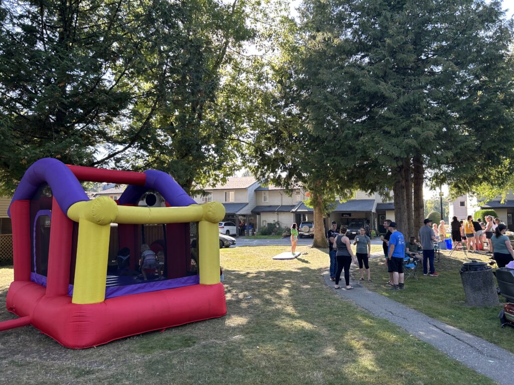 We live in a 100 unit townhouse complex. So there are many neighbours and many children around. There are always people moving in and out of the complex. Due to the busyness of life, among other things, it can be hard to get to know your neighbours. We decided to throw a community bbq on Saturday September 13th. Two weeks before, my daughter, a couple neighbourhood kids and I delivered paper invitations to all 100 units. We followed up by posting the info on our complex Facebook page a couple times to remind residents. A few neighbours wanted to help out in different ways so one brought out a personal bouncy castle they owned and others of us brought out various lawn games and activities . Families brought their own chairs. I bought all the food (hot dogs, buns, condiments, pop, juice, candies) and it was all provided for free (thanks to the grant). In the end we had over 60 people (including kids) attend and I think everyone had a great time. There is talk that we should make this an annual event and even neighbours who couldn’t attend shared how they’d like to participate if it happens again!