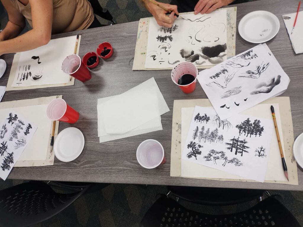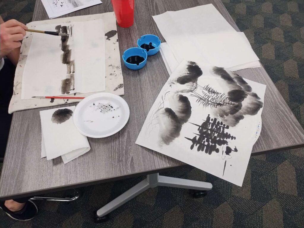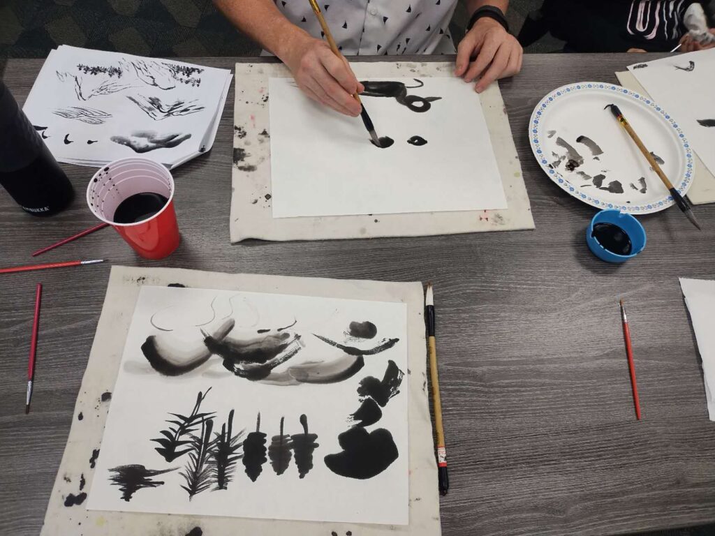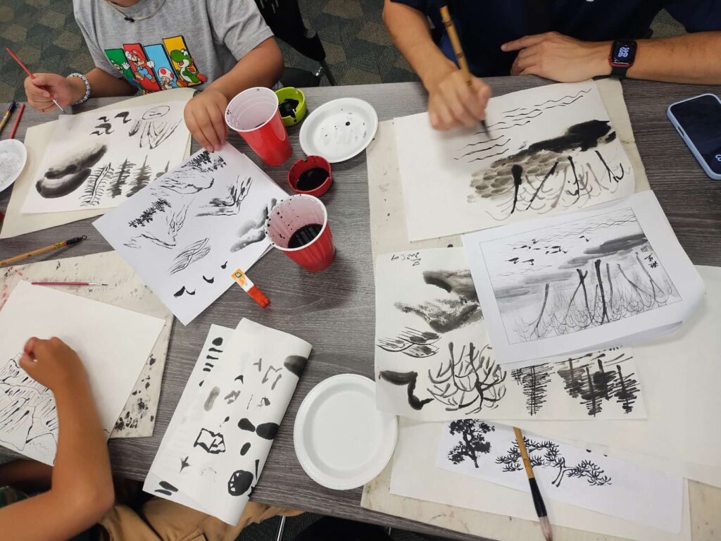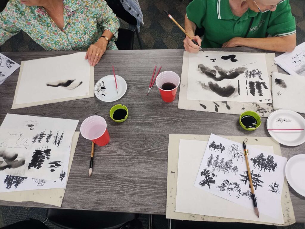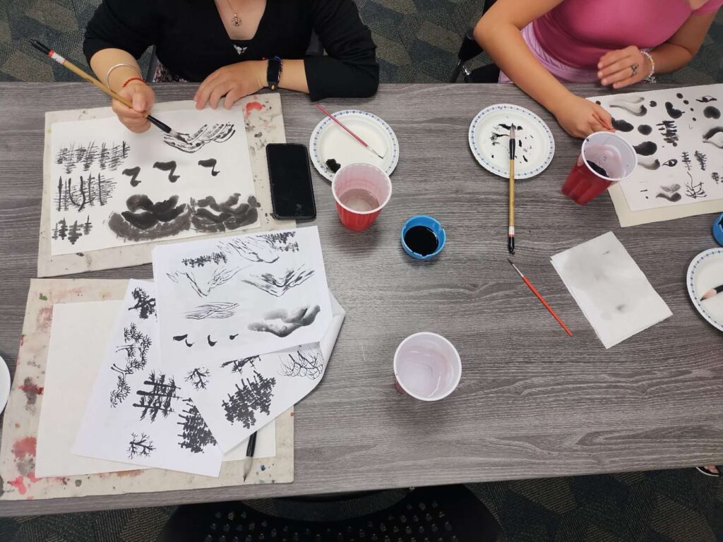After the cultural introduction, everyone had the chance to try painting with traditional brushes, ink, and paper. We practiced basic elements such as mountains, water, trees, and ducks. The hands-on activity was the highlight of the workshop. Each participant was able to complete two to three small artworks, combining different elements in their own unique way. The process encouraged creativity and confidence, even among those who had never painted before.