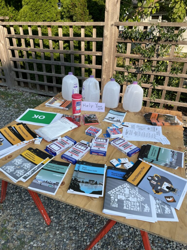 On Labor Day approx. 50 neighbours gathered for the annual block party.  This year we had a registration desk where folks made a name tag and received a raffle ticket.  They were encouraged to visit the resource table and take whatever info (gov’t of BC provided) and first aid supplies they could use in their emergency grab bag.  We raffled off some higher end first aid kits, water straws, etc.  The raffle was a big hit as 3-4 numbers were called at a time so there was incentive to get to the table and choose a prize.