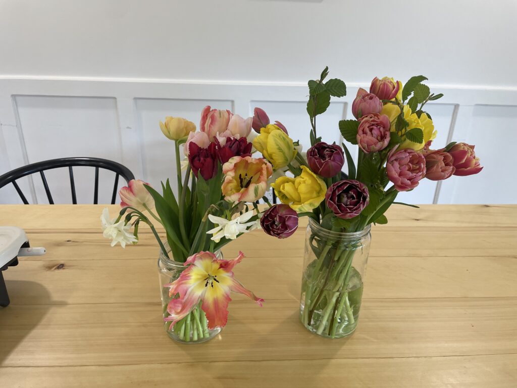 Between unpredictable temperature swings, prolonged rain spells, and limited periods of sustained warmth, the flowers struggled to establish themselves. Seedlings didn’t reach the level of growth or bloom production needed to support the project’s original goals but that doesn’t mean we didn’t have success. Cosmos and sunflowers did well enough to produce 13 bouquets to share with seniors in the community. We also purchased tulips, and several grocery store bouquets from the local Save-On and used local foliage to bulk up the bouquets.
