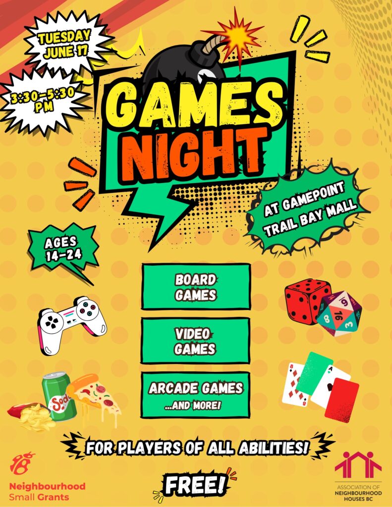 A need was identified – our community lacks recreational opportunties for youth and young adults with a disability and/or neurodivergence. An idea was born – let’s have individuals of all abilities come together in our community based on a shared interest – in this case we focused on playing games. We organized a GAMES NIGHT (really an afternoon) for players ages 14-24 to join us (about 7 volunteers) to come play with us (board games, video and arcade games) at a local gaming store in the mall. We had community members volunteer their time to set up and support youth with playing the games, we canvassed local businesses for donations and were able to offer pizza, pop, and a varitety of snacks. We invited youth and young adults of all abilities to join us. On the day off we had 20+ attendees, including youth and young adults with a disability and/or neurodivergence, family members, siblings and community members at large, playing games together. It was such a positive experience, that we wanted to do it again. We had a second GAMES NIGHT in August, thanks to the Neighbourhood Small Grants program, who made it possible for us to pay for the store rental twice 🙂 . This time, we had again 20 + attendees, many volunteers as well as snacks to offer. And this time we collected feedback. We received positive feedback from parents, participants and community members – this was an event that the community would like to see happen regularly. In collaboration with the business owner, we have decided to try out a regular ALL ABILITIES GAMES NIGHT every third Monday of the month starting January 2026 – with no cost involved. We will continue to support youth of all abilities be successful by having volunteers available – we have had community members express how much fun it was to do this and play games together. Thank you for your support – we could not have done it without the grant!!!!!!