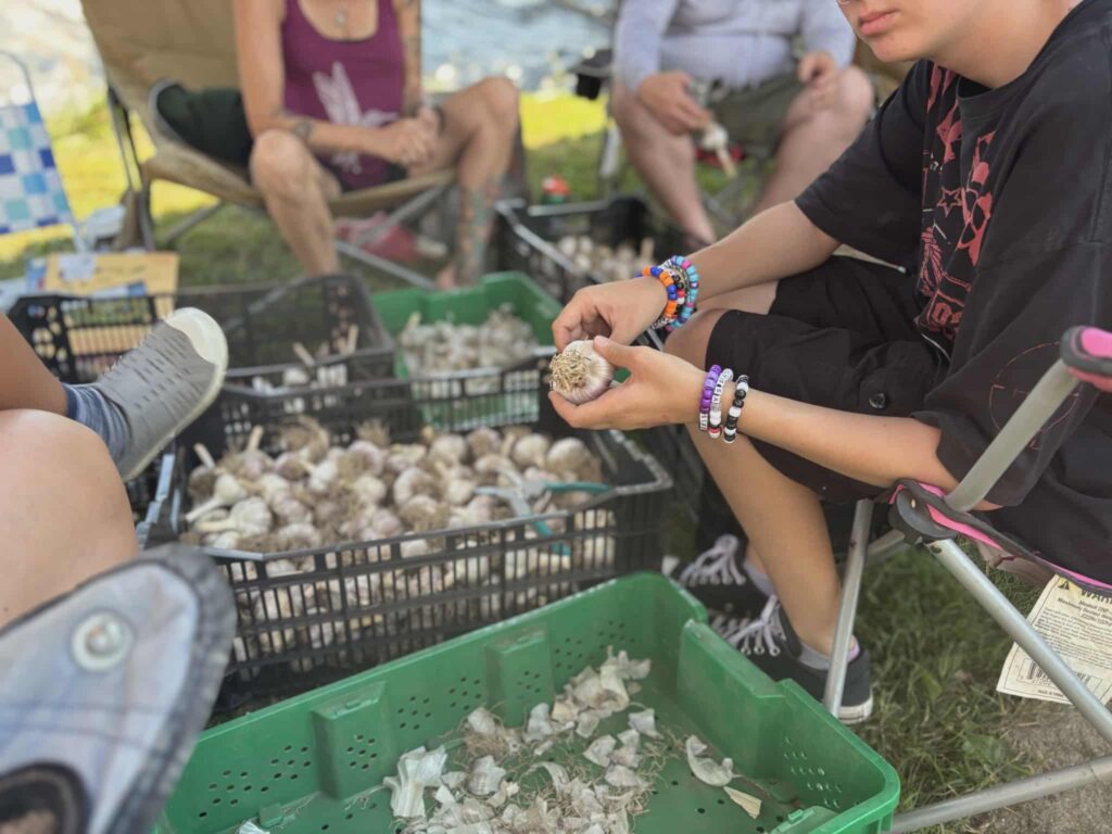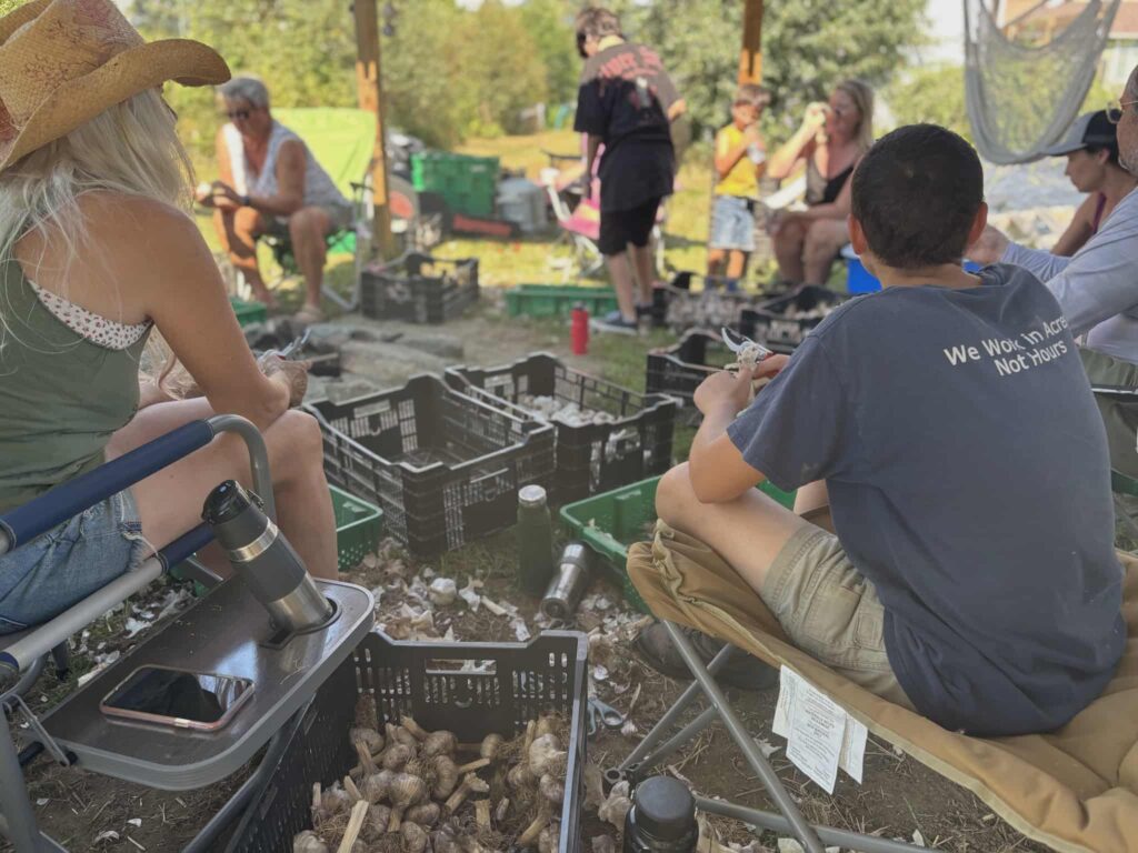 We chose to organize the work party portion of the event as a drop-in activity, allowing participants to stop by anytime between 10am and 3pm to lend a hand. We primarily spent this time sorting, cleaning, and grading garlic: a task that could be completed in the shade, without too much physical exertion.