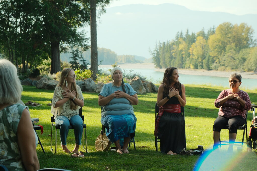 Our project, Gathering the Grandmothers – Nuun Hana’ack Shakdoa Ggatshwil a’amt, was held outdoors along the Skeena River on the traditional territory of the Kitselas people. With support from Neighbourhood Small Grants and Kitselas Nation, we created an all-nations gathering for Indigenous female Elders from across Northwest BC. The intention was to offer a calm, supportive, land-based space for rest, gentle movement, and reconnection.
