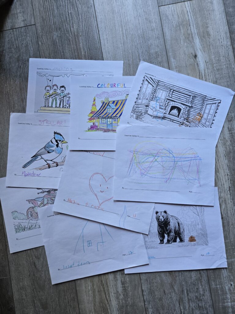 Our main activity was to put on an event which included opportunities for children and youth to play in the outdoor playground, engage in outdoor games such as giant Connect 4, corn hole tossing, and volleyball, as well as arts-based activities such as drawing and colouring their favorite things about Sunshine Valley. They also filled in the sentence ‘Sunshine Valley is….’ to go along with their art work, and had the opportunity to fill in a feedback form where they could share what types of events and activities they would like to see moving forward. We plan to incorporate the suggestions that we got from the feedback forms into future event and activity planning.