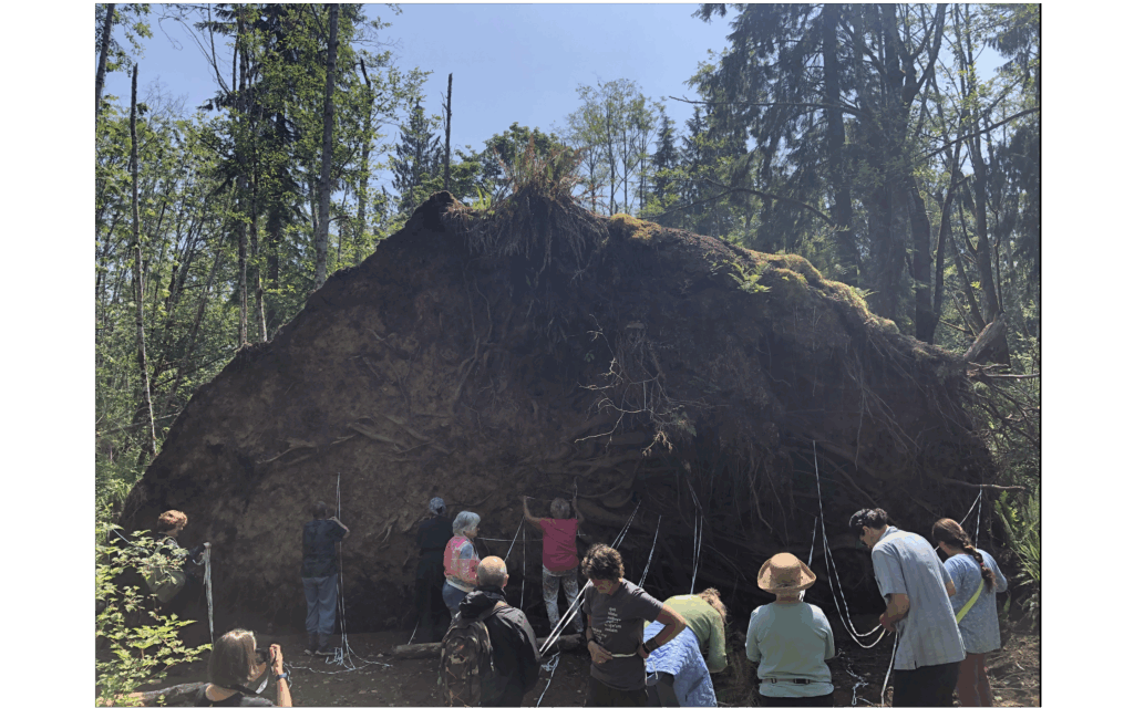 Carolina Franzen and I, Helena Wadsley, led a workshop, divided in two parts, that focussed on creativity and mindfulness while in the forest. We had about 20 participants altogether, some coming to both sessions. Starting off by walking in silence and noticing the small things around us, at our first stop, we did a couple of simple, introductory drawing exercises. At the same location, which was an open quarry in the middle of the forest, we laid out a long sheet of recycled paper and invited the participants to use their shoes as a stamp, stepping into biodegradable ink and walking across the paper. We invited the group to write a note to the forest which we left behind to be collected for the following session. During the second session, we focussed on sound and textures, doing some monoprinting of the ferns and flowers and drawing the sounds of birdsong. We finished by creating root extensions for a fallen tree. The combination of thinking about our presence in the forest, and how it had changed over time due to colonisation and development, with varied creative activities created a meaningful and fun experience.